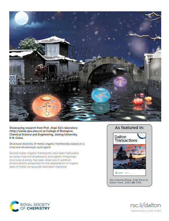 课题组以2,6-二(4-羧基苯亚甲基)环己酮为配体,选用若干过渡金属合成一系列具有结构新颖性的金属-有机框架材料,该结果发表在道尔顿汇刊(Dalton Transactions, 2020, 49: 5783-5786)并被选为封底文章。金属-有机框架材料以其丰富多变的结构特征、广泛的用途得到化学工作者的持续关注。