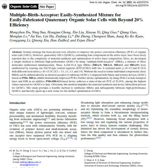 周二军团队在有机太阳能电池方向取得重要研究进展。相关研究成果以“Multiple-Birth-Acceptor : Easily-Synthesized Mixture for Easily-Fabricated Quaternary Organic Solar Cells with Beyond 20% Efficiency”为题,在化学类顶级期刊《Angew. Chem. Int. Ed.》上发表。这是我校首次以第一单位在该顶级期刊发表论文,第一作者为暗网禁区