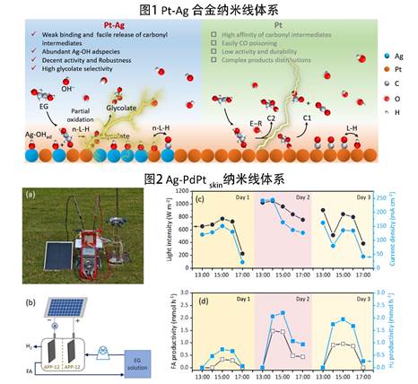 曹雪波研究团队的指导下,马佳敏等本科生携手杨颖等研究生开展研究,他们发现,Ag原子作为辅助金属,不仅通过传统配体效应优化催化中心Pt/Pd的电子结构,进而促进乙二醇的催化氧化,还借助原位电化学光谱学技术与理论计算揭示了Ag原子的另一重要作用:加速催化剂活化水分子,并产生羟基自由基(*OH),形成Ag-OH活性物种。Ag-OH活性物种能以一种更优的、非竞争性的Langmuir–Hinshelwood机制加速醇脱质子(图1),并快速释放氧化的碳基中间体,从而高选择性、高通量地得到目标产物乙醇酸与氢气,并能有效防止催化剂毒化,相关成果发表于中科院一区期刊上(Journal of Colloid and Interface Science 2025,684,197–206)。该研究小组还发现,在Ag-PdPtskin纳米线催化的乙二醇电氧化耦合制氢体系中,在>1.2 V电位下,会形成Ag2+。Ag活性物种能以非法拉第的模式直接氧化乙二醇与某些有毒中间体,从而提高催化剂的活性与抗中毒能力。在以粗乙二醇为原料的无膜电解制氢体系中,表现出超过3000小时的稳定性与工业级电流密度(>400 mA/cm2)(图2),相关成果发表于中科院一区期刊上(Advanced Functional Materials. 2024, 2418588)。以上研究受到国创项目(《银纳米线选择性电氧化醇耦合制氢》,马佳敏等人,指导老师黄林/曹雪波)、国家自然科学基金(no.22275074与22102063)与企业横向等课题的资助。